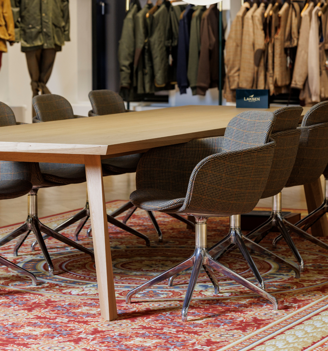Unser Chair no. One S2 hat im Showroom von Laksen Sporting, die eine Vorliebe für karierten Tweed haben, einen individuellen Look erhalten.