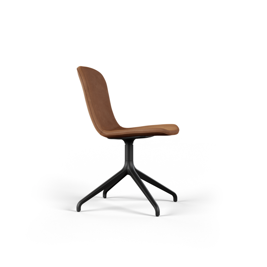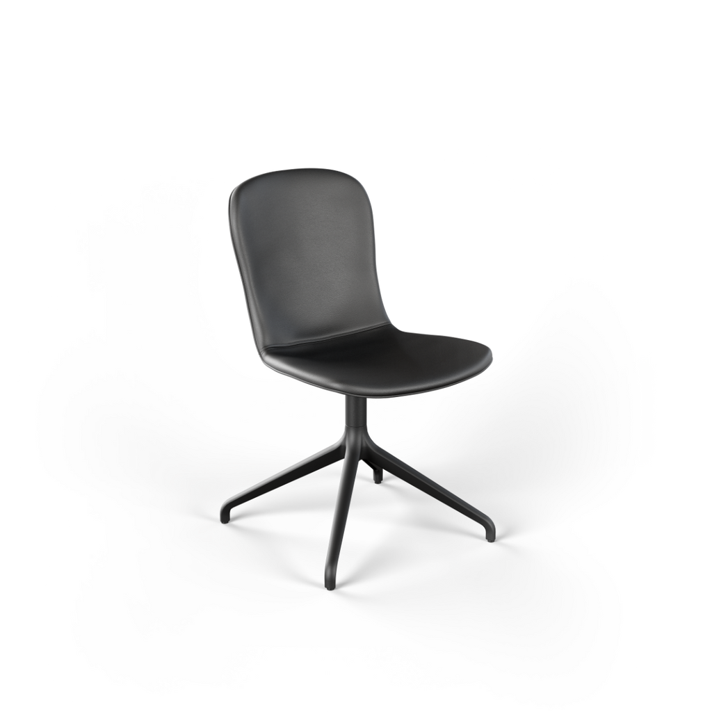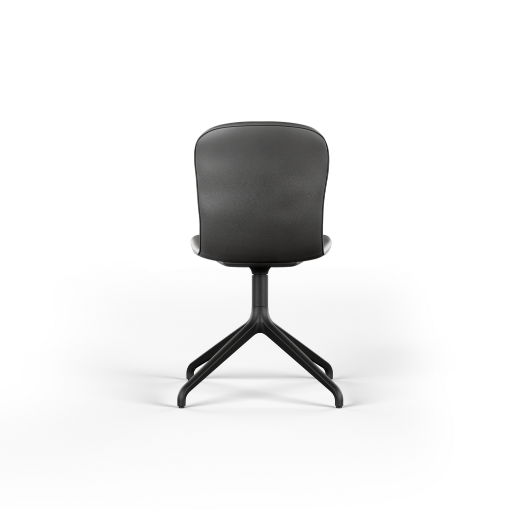 Auch das Gestell des Stuhls besteht aus 25% recyceltem Stahl und recyceltem Aluminium für das Drehgestell und ist mit nordischem, rückverfolgbarem Leder von SPOOR gepolstert.