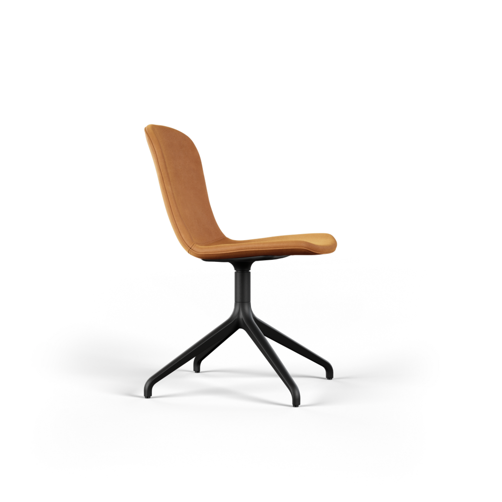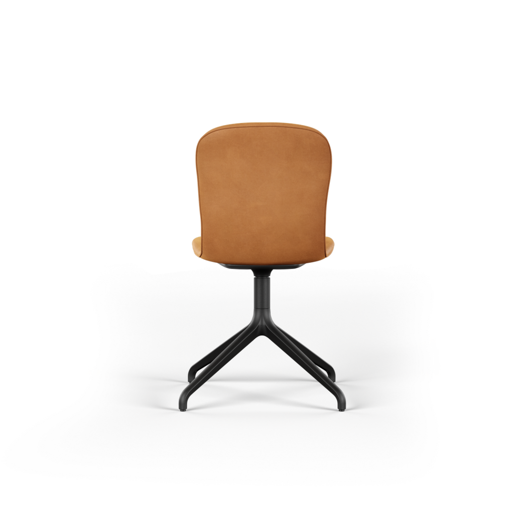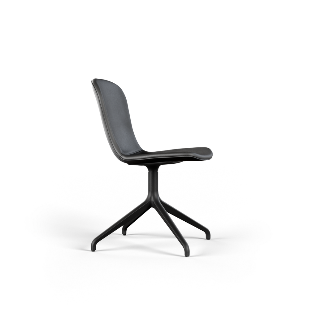 Auch das Gestell des Stuhls besteht aus 25% recyceltem Stahl und recyceltem Aluminium für das Drehgestell und ist mit nordischem, rückverfolgbarem Leder von SPOOR gepolstert.