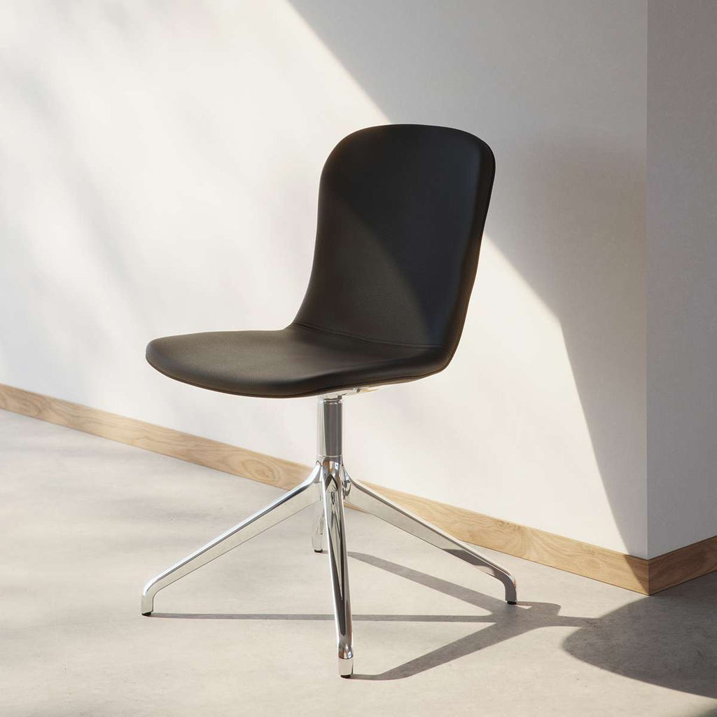 Chair no. One ist ein Esszimmerstuhl mit kompromisslosem Design, der aus sorgfältig ausgewählten Materialien hergestellt wird und bei dem Nachhaltigkeit und Qualität im Vordergrund stehen. Das Gestell ist aus recycelbarem Aluminium, während die Sitzfläche aus recyceltem Kunststoff besteht und mit hochwertigem SPOOR-Leder gepolstert ist.