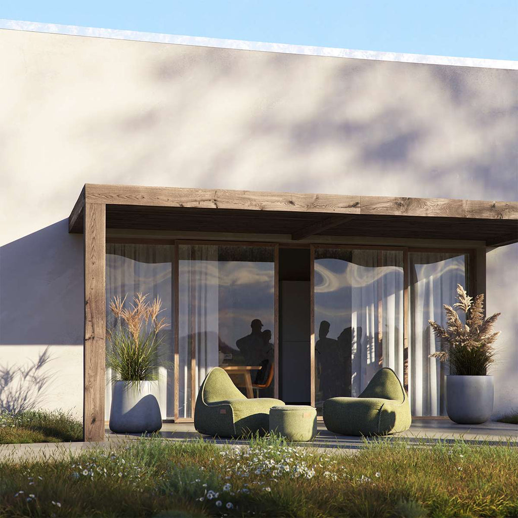 Cobana Pouf besteht aus strapazierfähigem, wasserabweisendem und lichtechtem Textil mit einer Lichtechtheit von 7 bis 8 auf einer Skala von 1 bis 8. Er kann den ganzen Sommer über draußen stehen, bei Sonne und Regen, und eignet sich ebenso als Loungesessel im Innenbereich. Er ist auch in einer reinen Indoor-Version erhältlich und kann mit einem passenden Pouf ergänzt werden.