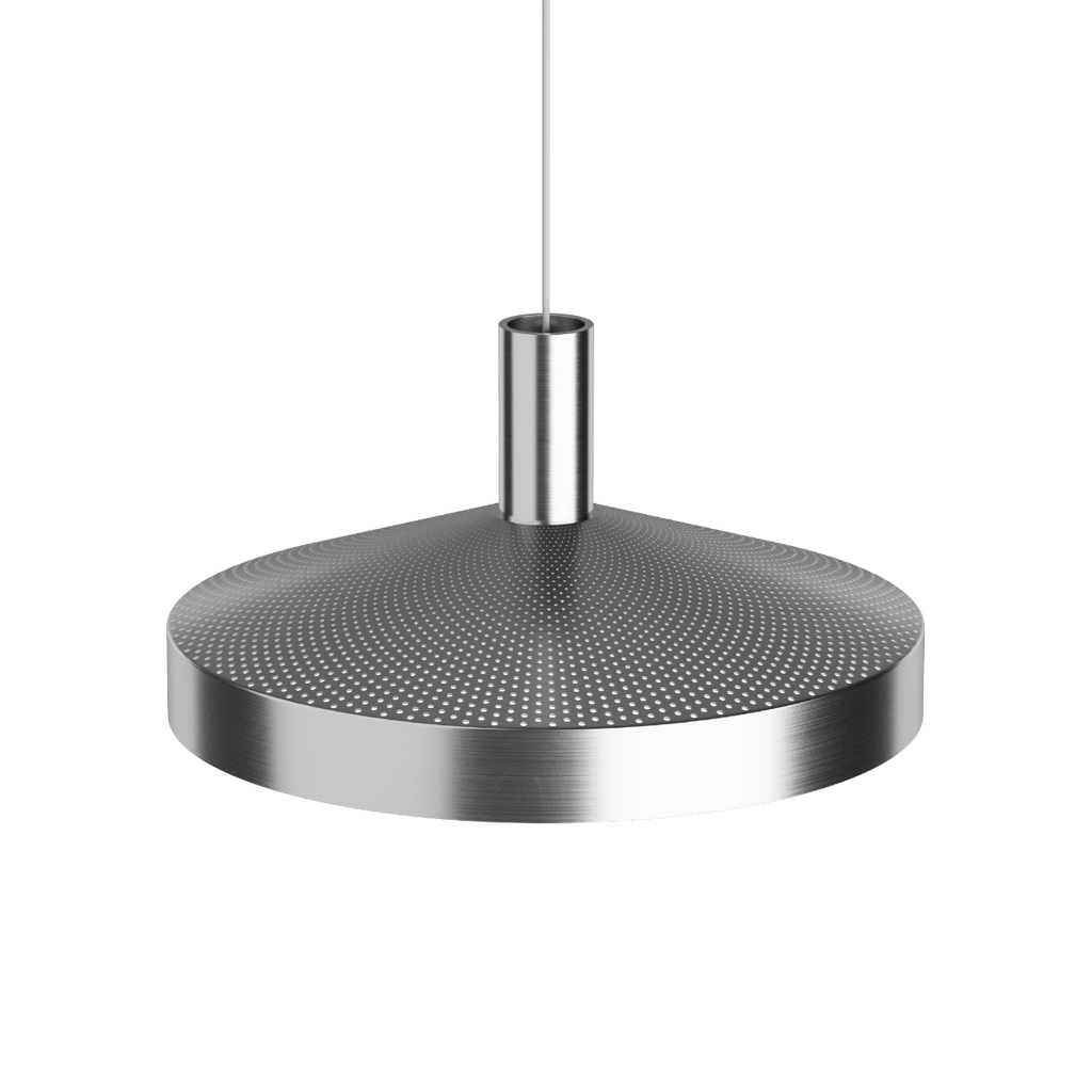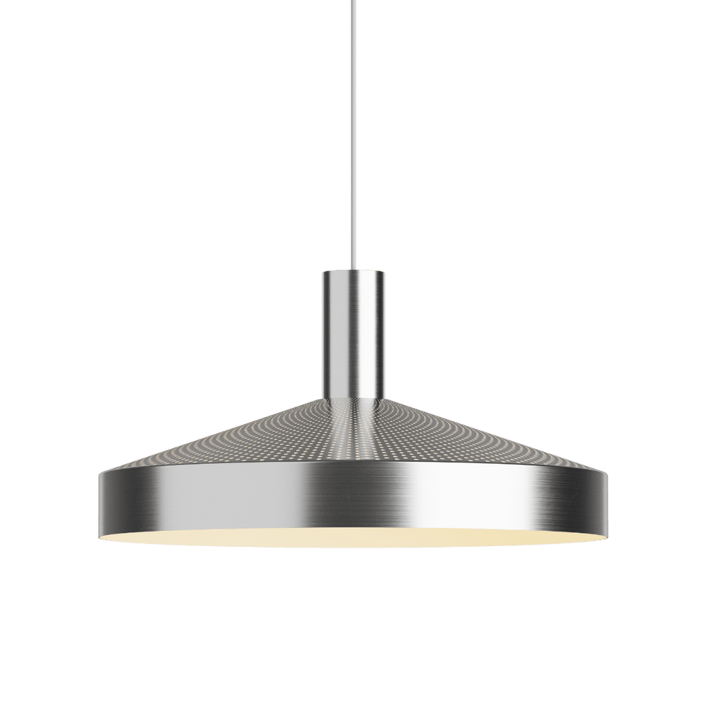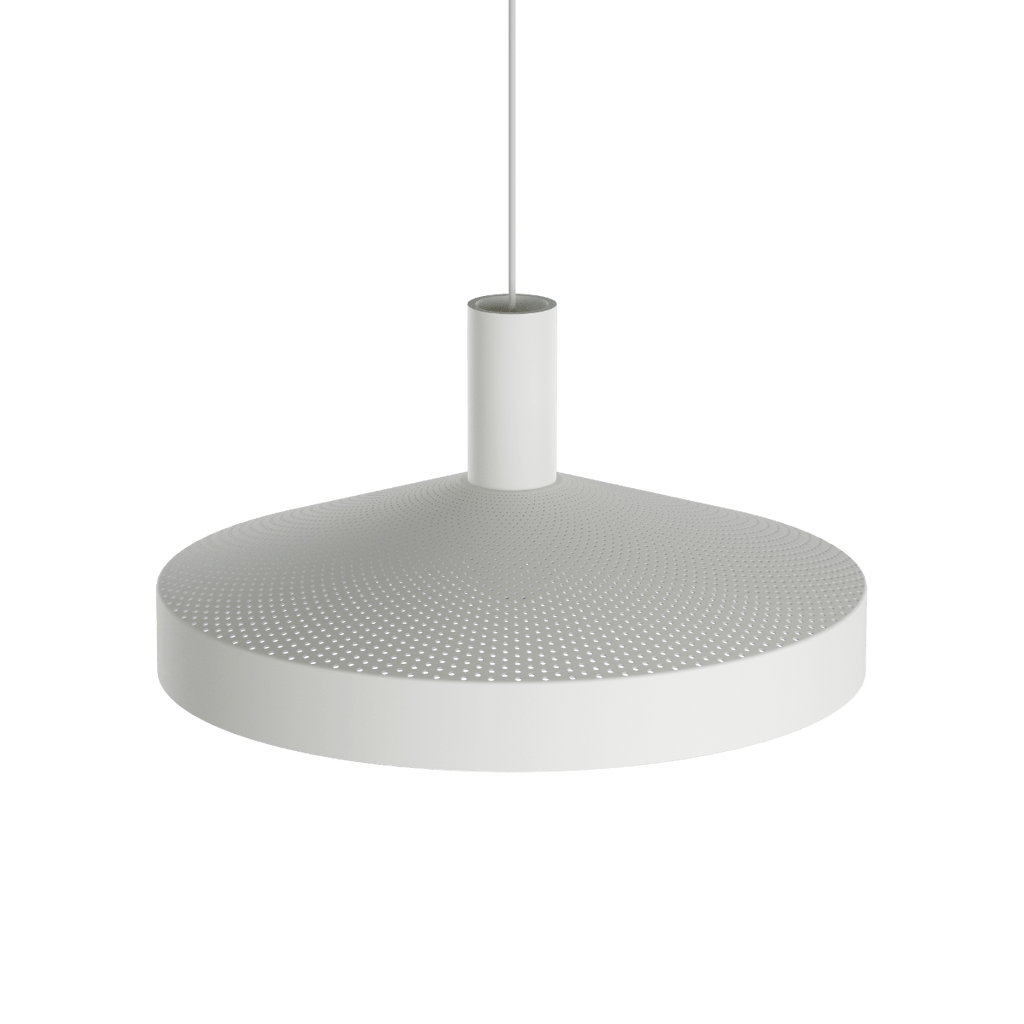Die weiß lackierte Innenseite und das zurückgesetzte, kopfverspiegelte E27-Leuchtmittel sorgen für angenehmes, blendfreies Licht nach unten. Gleichzeitig erzeugt die Perforation ein dezentes Up- & Down-Light, das die Fläche aktiviert und ein differenziertes Lichtbild schafft. Dawn ist in Weiß, polished metal und Schwarz sowie in zwei Größen, Ø25 und Ø40, erhältlich.