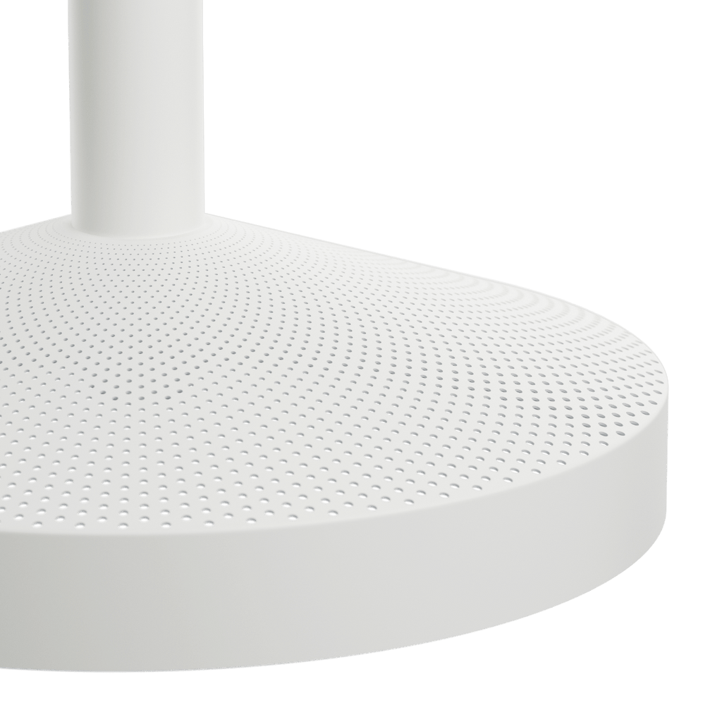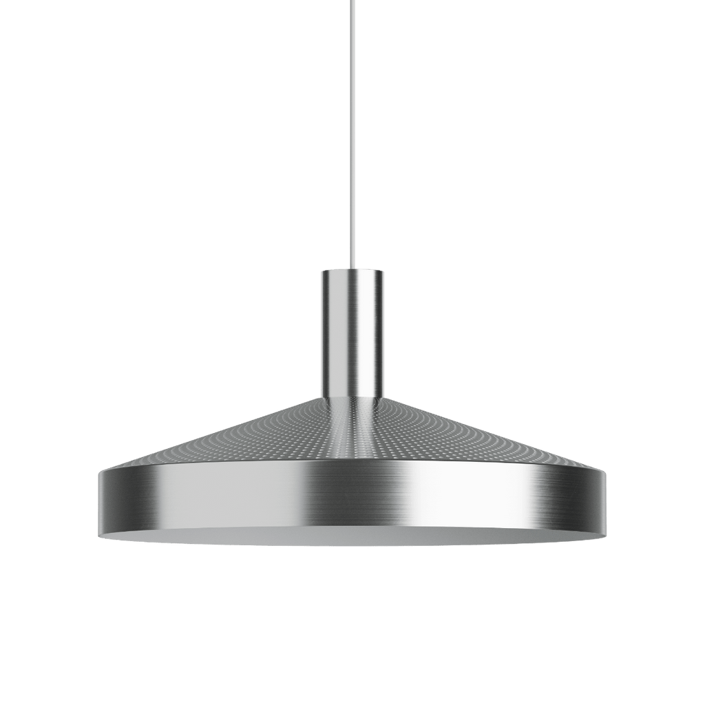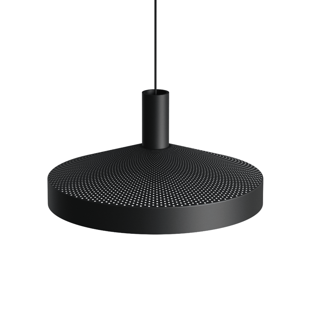Die weiß lackierte Innenseite und das zurückgesetzte, kopfverspiegelte E27-Leuchtmittel sorgen für angenehmes, blendfreies Licht nach unten. Gleichzeitig erzeugt die Perforation ein dezentes Up- & Down-Light, das die Fläche aktiviert und ein differenziertes Lichtbild schafft. Dawn ist in Weiß, polished metal und Schwarz sowie in zwei Größen, Ø25 und Ø40, erhältlich.