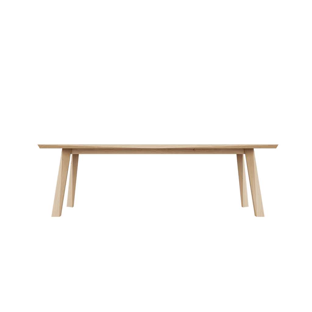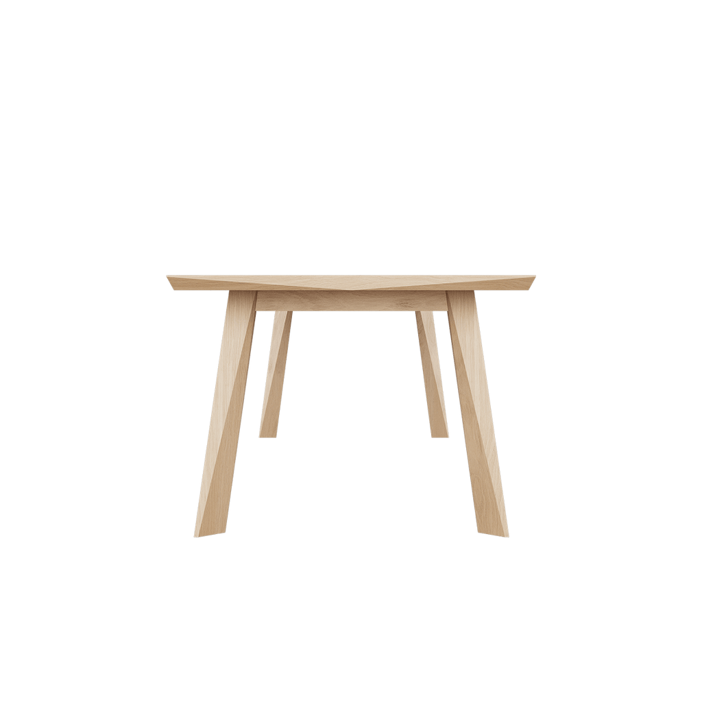 Ein ästhetisch schöner Esstisch aus europäischer Eiche mit prächtigen Details und sorgfältig ausgearbeiteten Facetten. Die Facetten des Tisches erzeugen einen einzigartigen Ausdruck, der sich im Laufe des Tages mit dem wechselnden Licht verändert. Dies verleiht dem Design des Tisches eine subtile Dynamik.