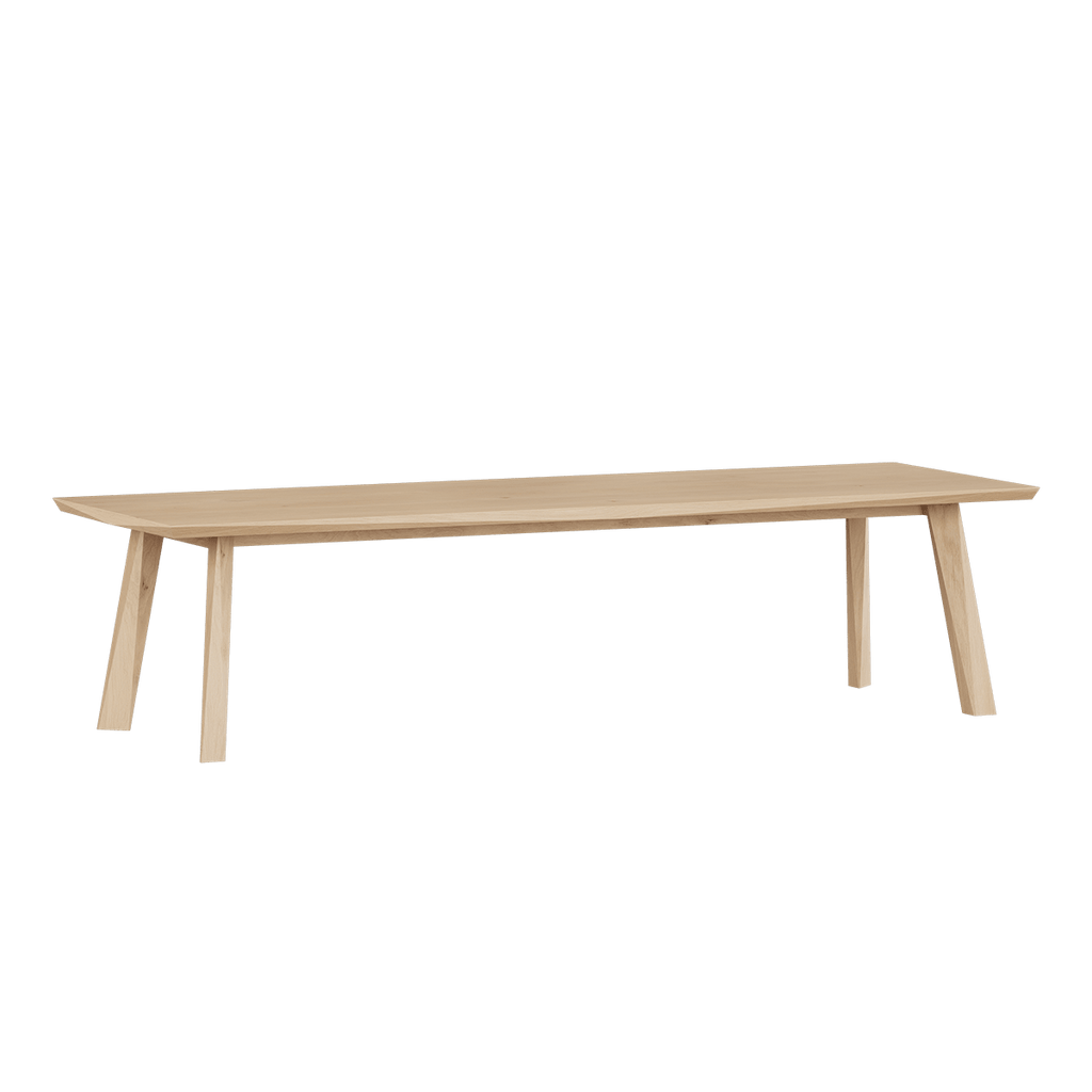 Ein ästhetisch schöner Esstisch aus europäischer Eiche mit prächtigen Details und sorgfältig ausgearbeiteten Facetten. Die Facetten des Tisches erzeugen einen einzigartigen Ausdruck, der sich im Laufe des Tages mit dem wechselnden Licht verändert. Dies verleiht dem Design des Tisches eine subtile Dynamik.