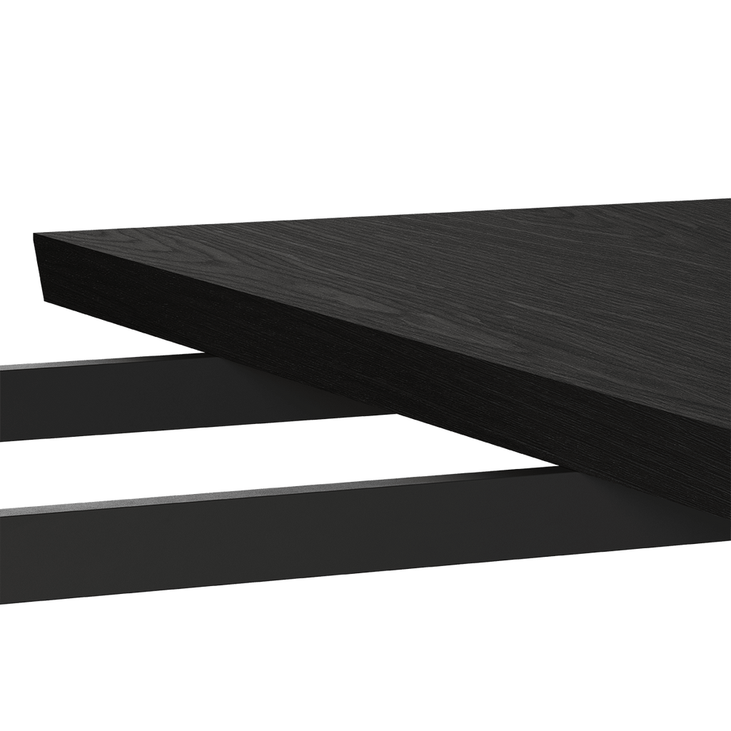 Erweitere deinen Edge Dining Table mit einer Verlängerungsplatte, die einfach mit Rändelschrauben zu montieren ist und dasselbe Material und dieselbe Konstruktion wie der Tisch aufweist. Die Verlängerungsplatte ist aus schwarz gebeiztem Eichenfurnier gefertigt, wobei die Maserung des Holzes quer verläuft, was einen gewollten und attraktiven Kontrast erzeugt, wenn sie auf den Tisch montiert wird.