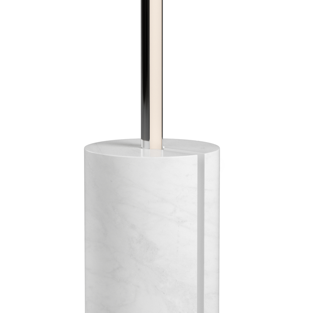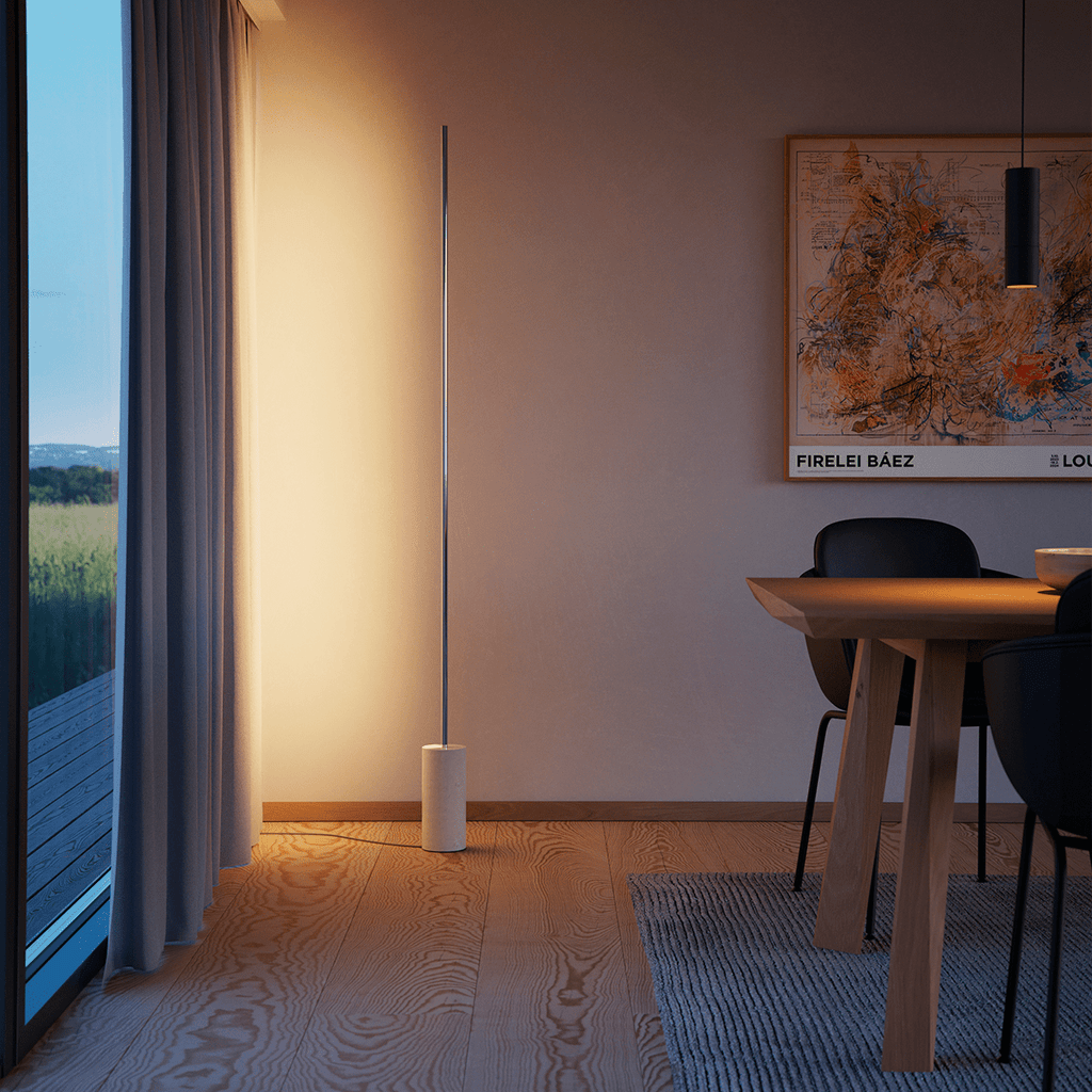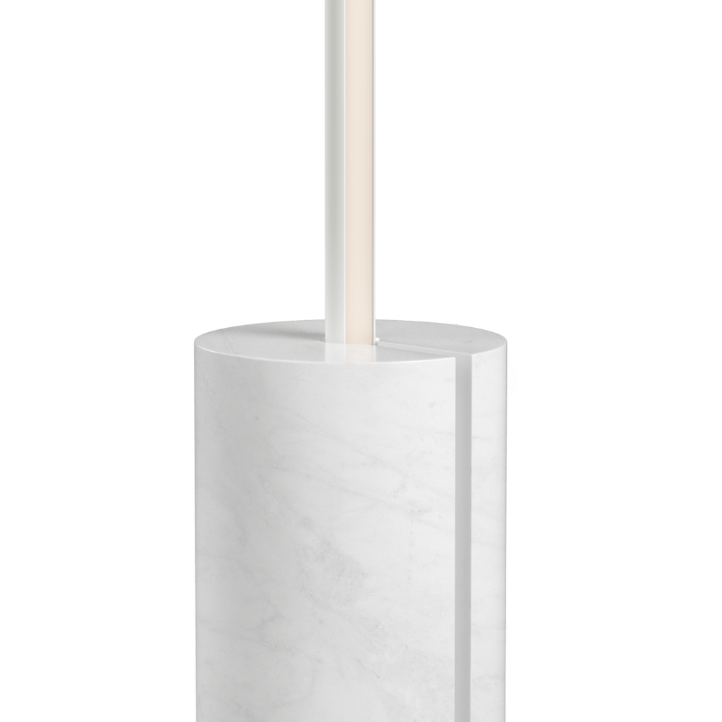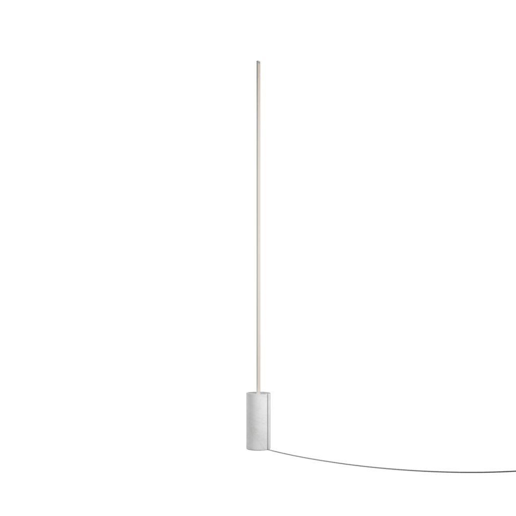 Funktionalität vereint. Das schlanke Aluminiumprofil und der stilvolle Marmorsockel der Leuchte werden mit einem vertikalen, mattierten LED-Streifen kombiniert, der ein weiches, nach oben gerichtetes Licht für einen einfachen und minimalistischen Look erzeugt.