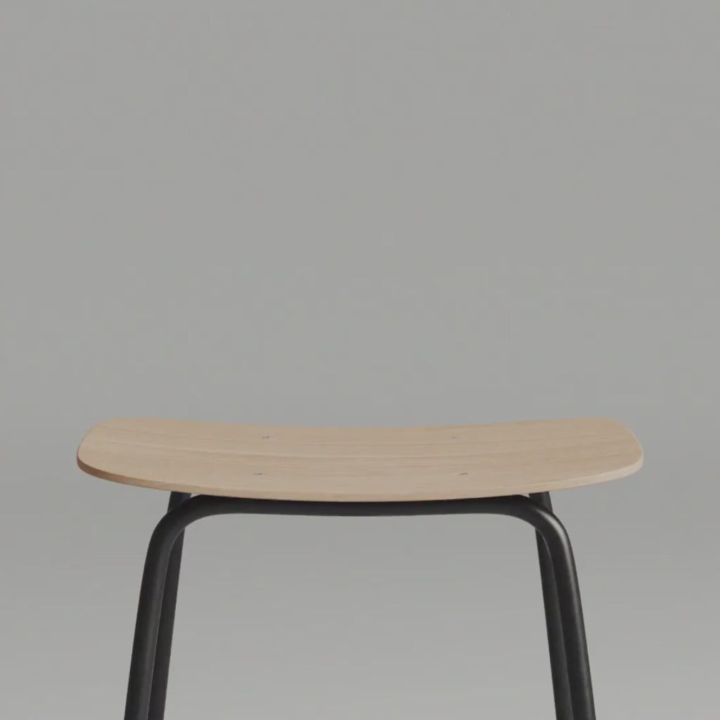 Der Sitz besteht aus Eichenfurnier mit matter Oberfläche, die die natürliche Struktur des Holzes hervorhebt. Das Gestell aus pulverbeschichtetem Stahl verleiht dem Barhocker eine rohe Note und unterstreicht das industrielle Formensprache.
