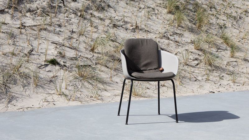 Genieße das Leben draußen mit dem Patio Chair no. One. Ein Outdoor-Esszimmerstuhl in kompromisslosem Design mit Fokus auf Komfort und Ästhetik. Die Sitzschale besteht aus wiederverwendetem Kunststoff und der Rahmen aus Stahl. Dieses Design bietet dir einen fantastischen Komfort und Halt.